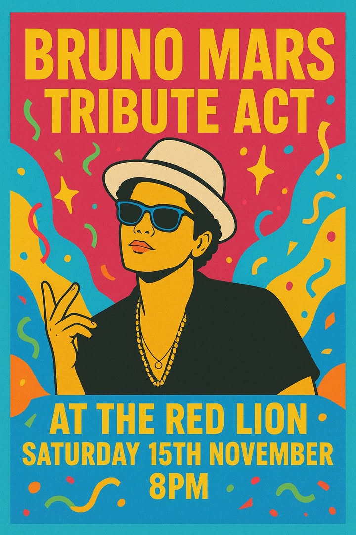 🎤 This Saturday at The Red Lion! 🎶 Get ready for an unforgettable night with a Live Bruno Mars Tribute Act — performing all your favourite hits from 8PM. Bring your friends and dance the night away to the sounds of “Uptown Funk,” “Treasure,” and more! 📍 The Red Lion 🗓️ Saturday 15th November ⏰ From 8PM – Late ✨ Don’t miss out — it’s going to be 24K Magic! ✨ #BrunoMarsTribute #LiveMusic #TheRedLion #SaturdayNightVibes #UptownFunk #LiveAtTheRedLion