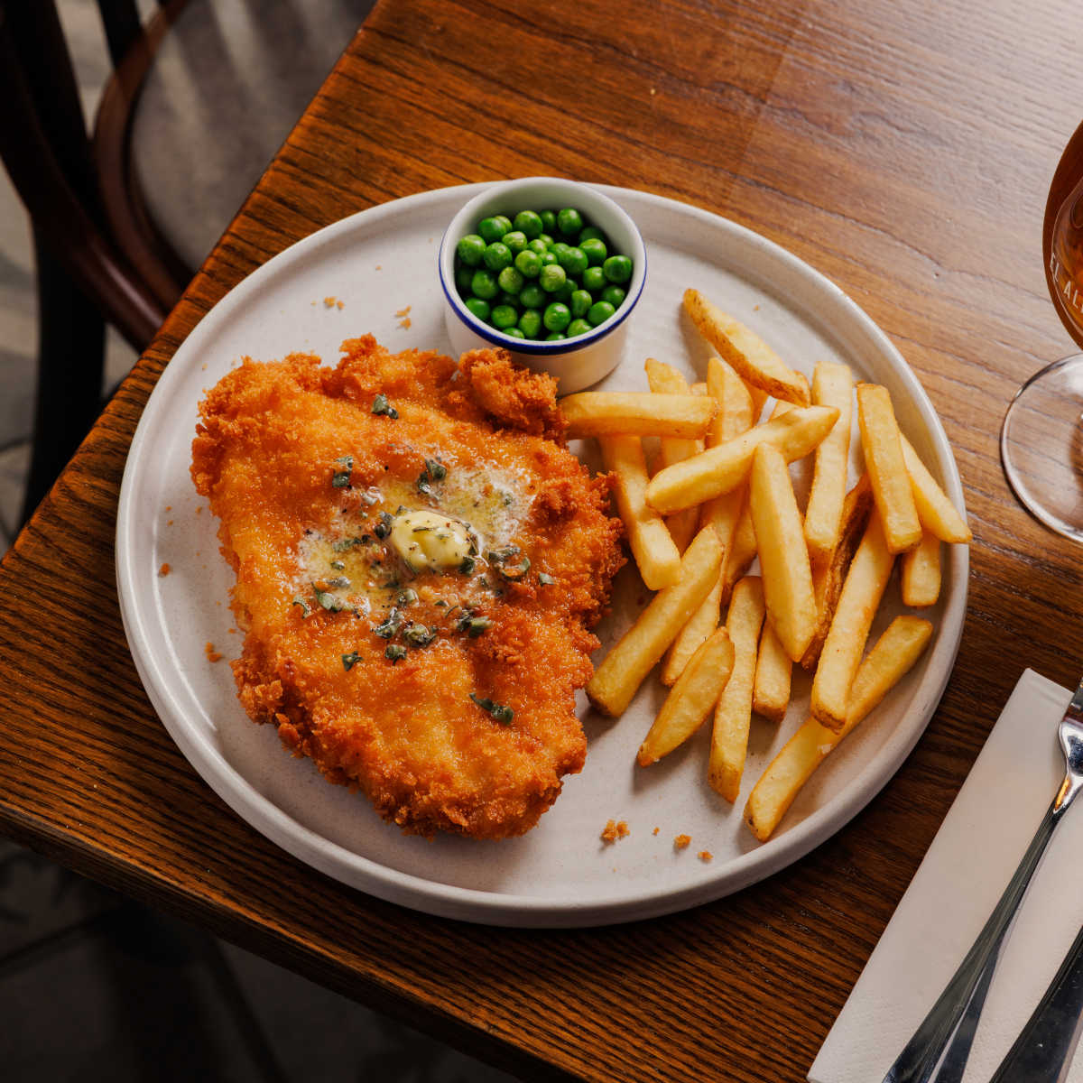Crispy chicken schnitzel, breaded chicken topped with garlic butter, with chips and garden peas | 14.49 1364 kcals