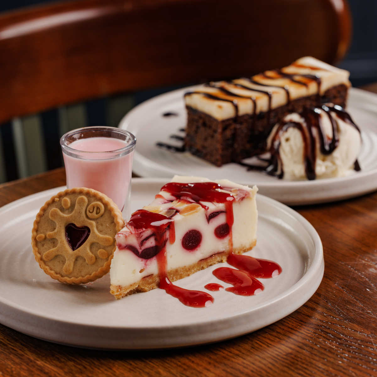 Jammie dodger cheesecake, raspberry & cherry cheesecake topped with almonds, with a boozy raspberry shot on the side (contains alcohol) (v) | 7.29 601 kcals