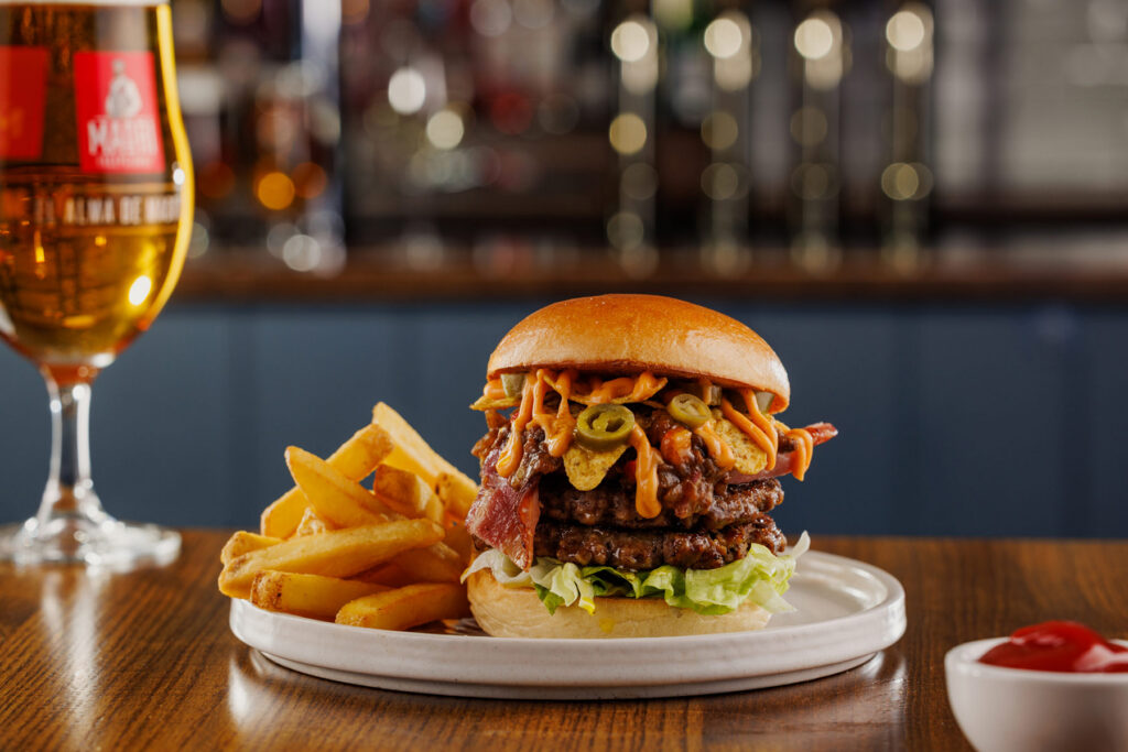 Classic burger, two 3oz beef patties with burger sauce. Served in a toasted brioche-style bun with chips | 12.99 1378 kcals